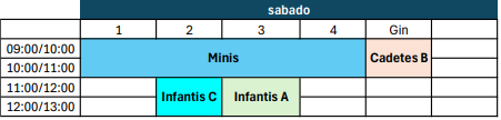 | 9:00/11:00 | Minis | Minis | Minis | Minis | Cadetes B | - |