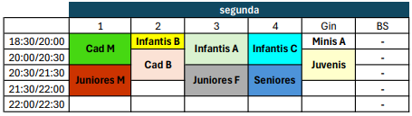 | 18:30/20:00 | Cad A | Infantis B | Cad M | Juvenis | Minis B | - |