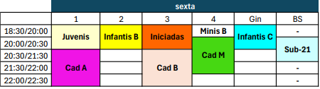 | 18:30/20:00 | Infantis A | Infantis B | Infantis C | Cad M | Minis A | - |