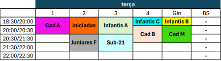| 18:30/20:00 | Infantis A | Infantis B | Infantis C | Iniciadas | Cad A | - |